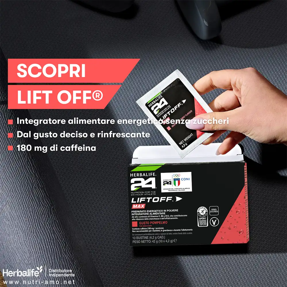 LiftOff Max Herbalife 24 al gusto pompelmo รจ un integratore alimentare che contribuisce a ridurre la stanchezza e l’affaticamento